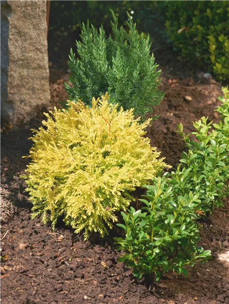 Immergrüne Pflanzen wie die Zwergformen von Koniferen, aber auch Buchs, Spindelsträucher oder Efeu stehen dem