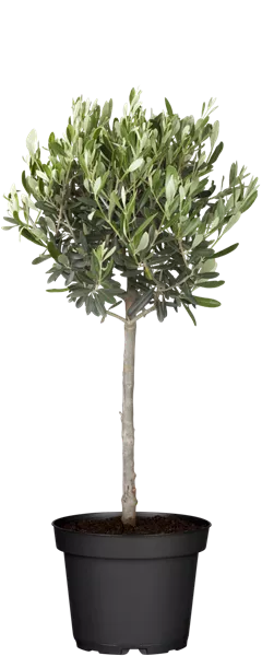 Ein Oliven-Stämmchen (Olea europaea) ist der Inbegriff eines mediterranen Sommers. Die Pflanze gehört zu den ältesten Nutzpflanzen und wird in freier Natur 10 bis 20 m hoch. Da ein Olivenbaum sehr langsam wächst, sind hochwachsende Exemplare sehr alt. In ihrer Heimat können sie 1.000 Jahre alt werden. Im Topf wird Ihr Oliven-Stämmchen (Olea europaea) ca. 1,50 m groß. Trockenheit und Wind verträgt es gut, aber ihr Platz darf nicht zugig sein. Ab Mitte September sollte der Olivenbaum ins Winterquartier umziehen. Das Treppenhaus, der Wintergarten oder ein anderer geschützter Ort sind hierfür ideal.